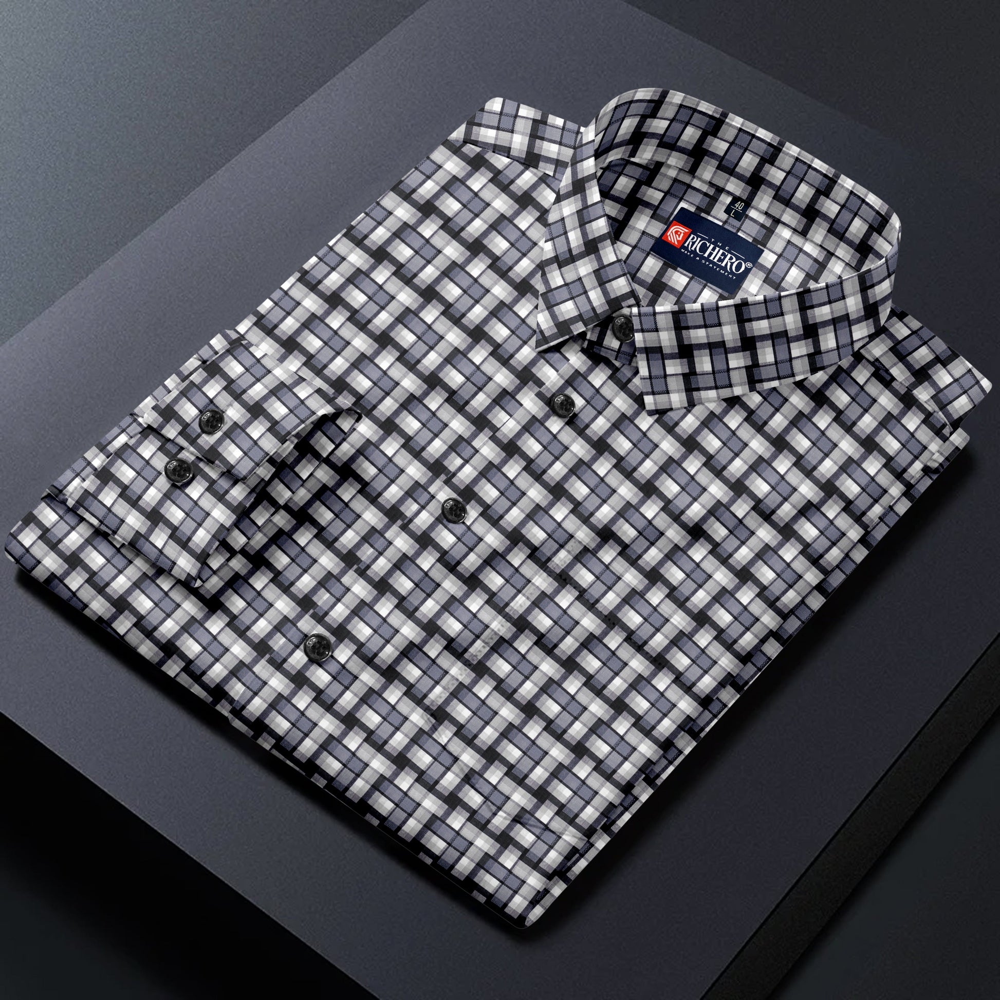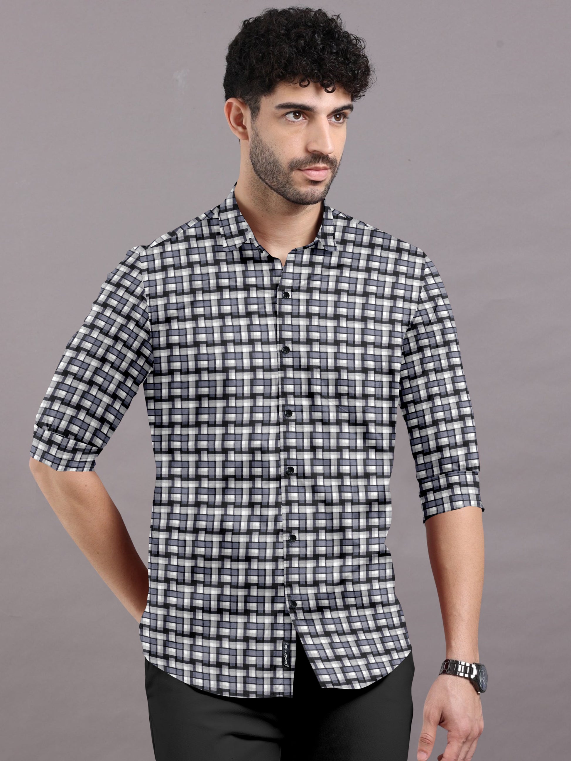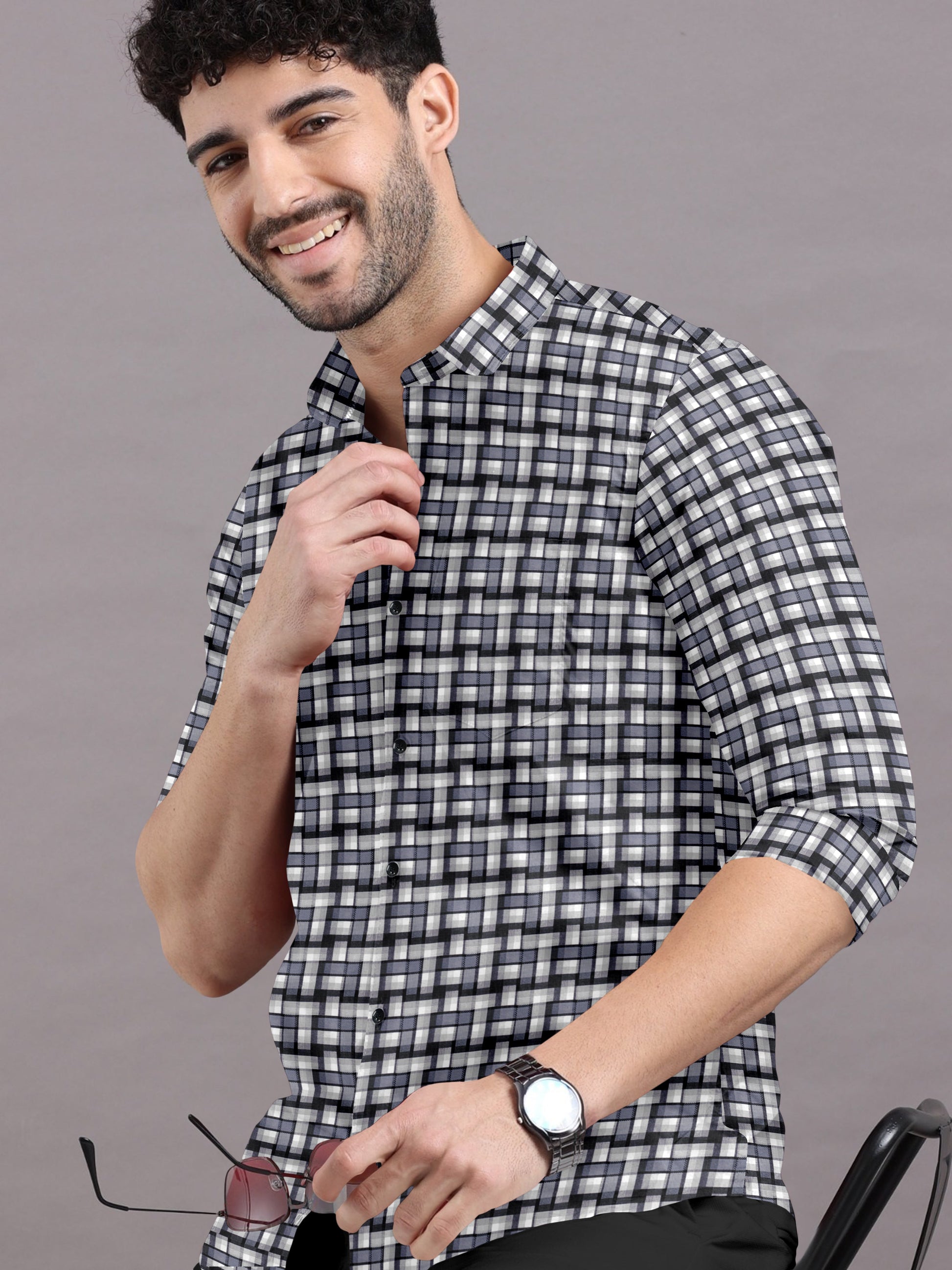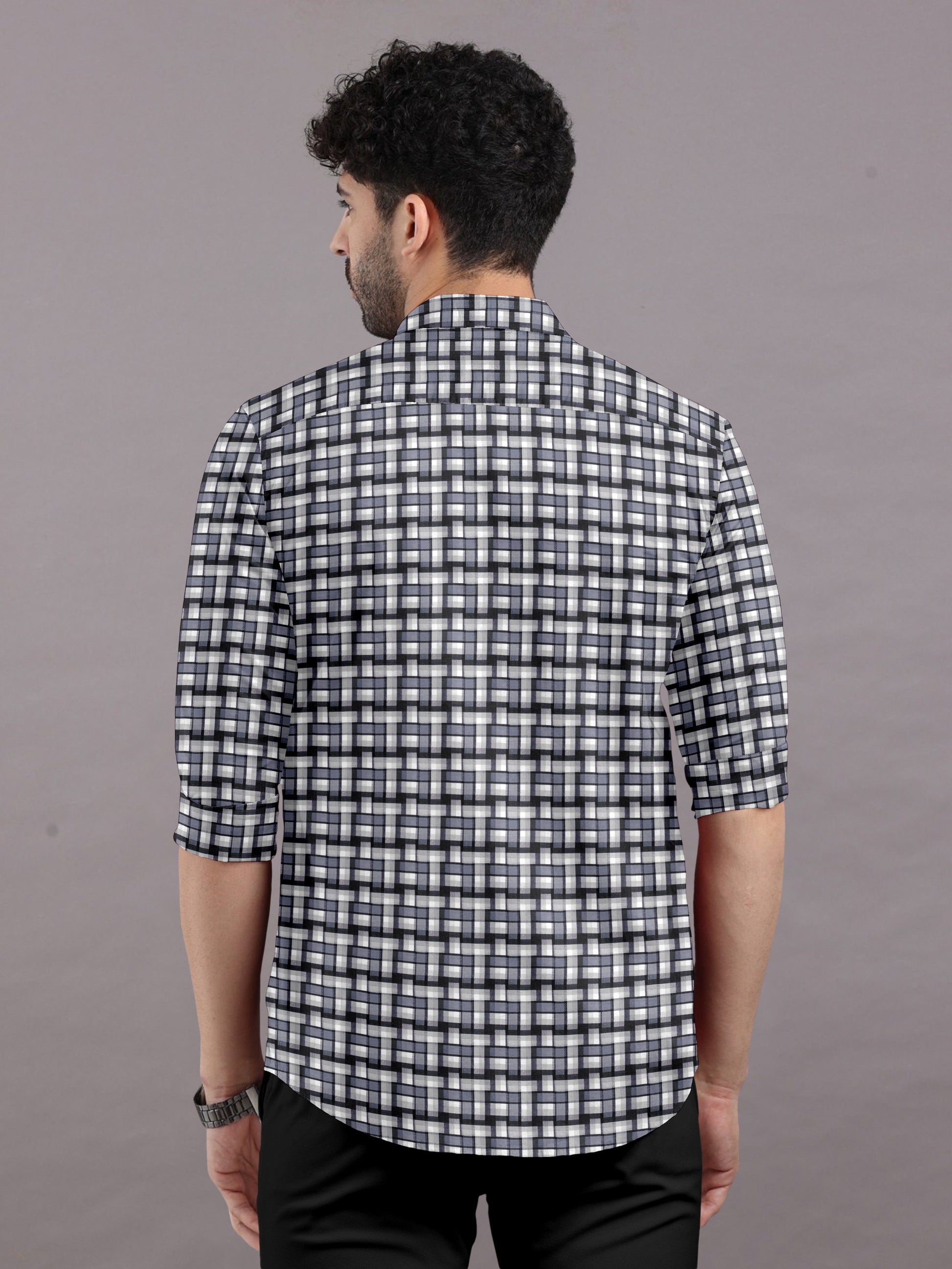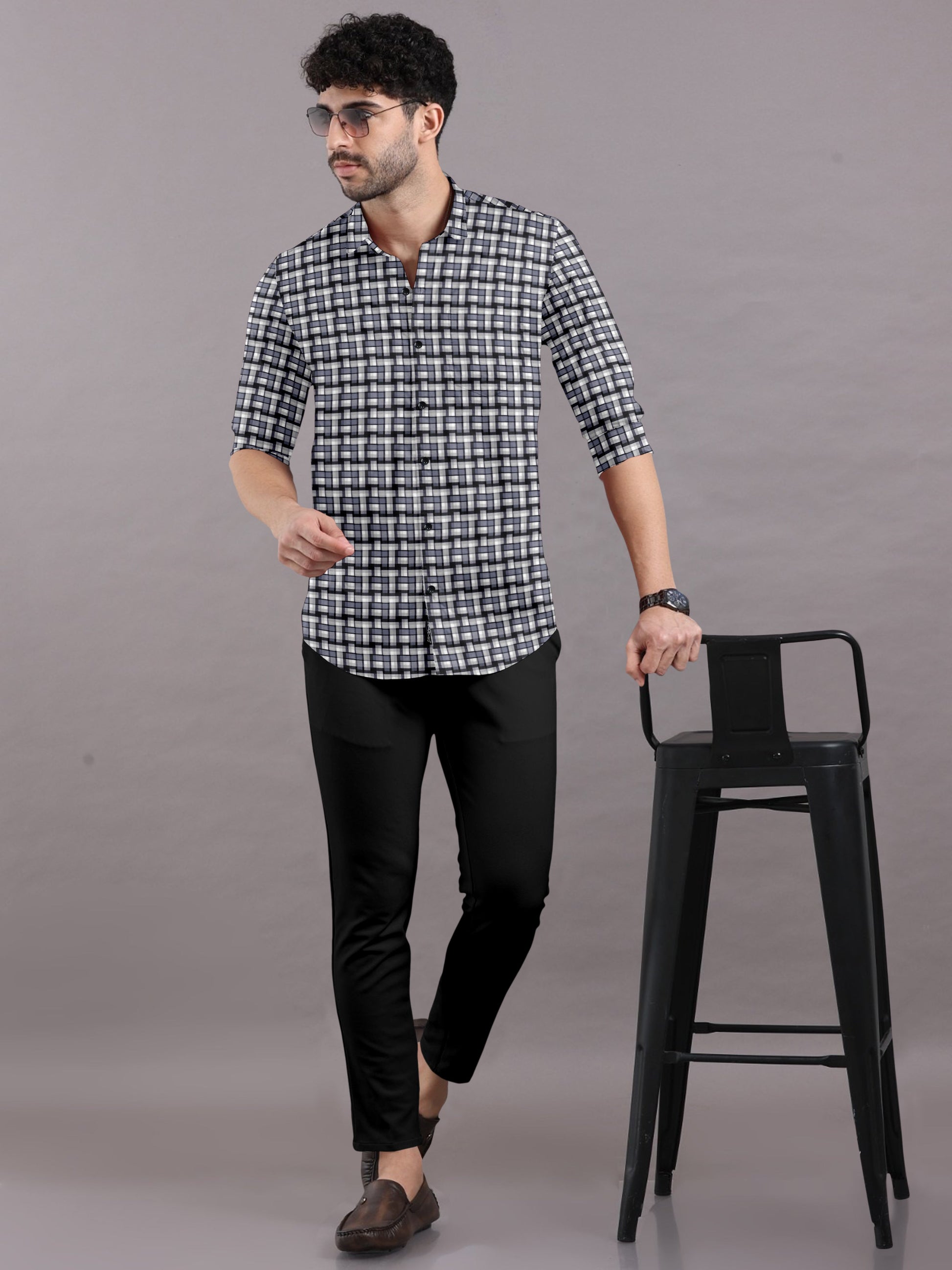 Your go to shirt for formal and casual meets. Command attention with striking dark blue & white checks in pure cotton fabric and featuring a mandarin collar.